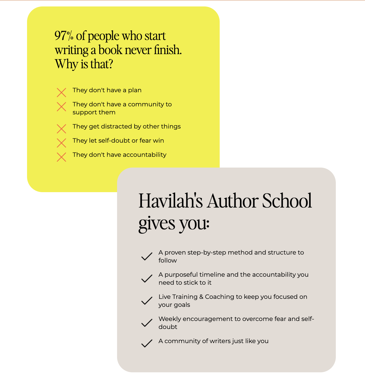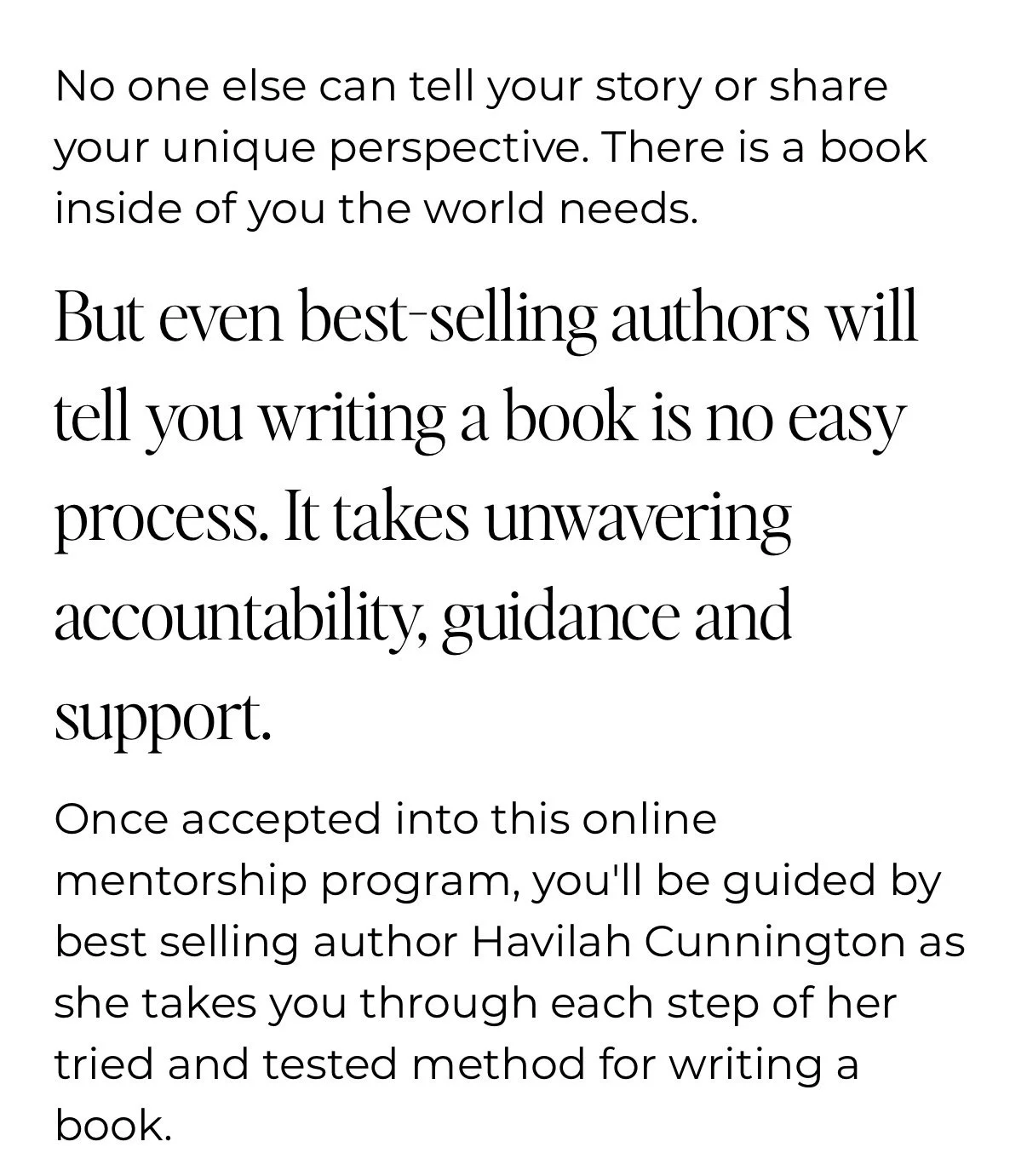 With the dream of making writing a book more accessible, Havilah created a lower-cost, self-paced course that was already performing well. Her goals was to take that course and create a premium, 4-month intensive program for people who were serious about writing a book.